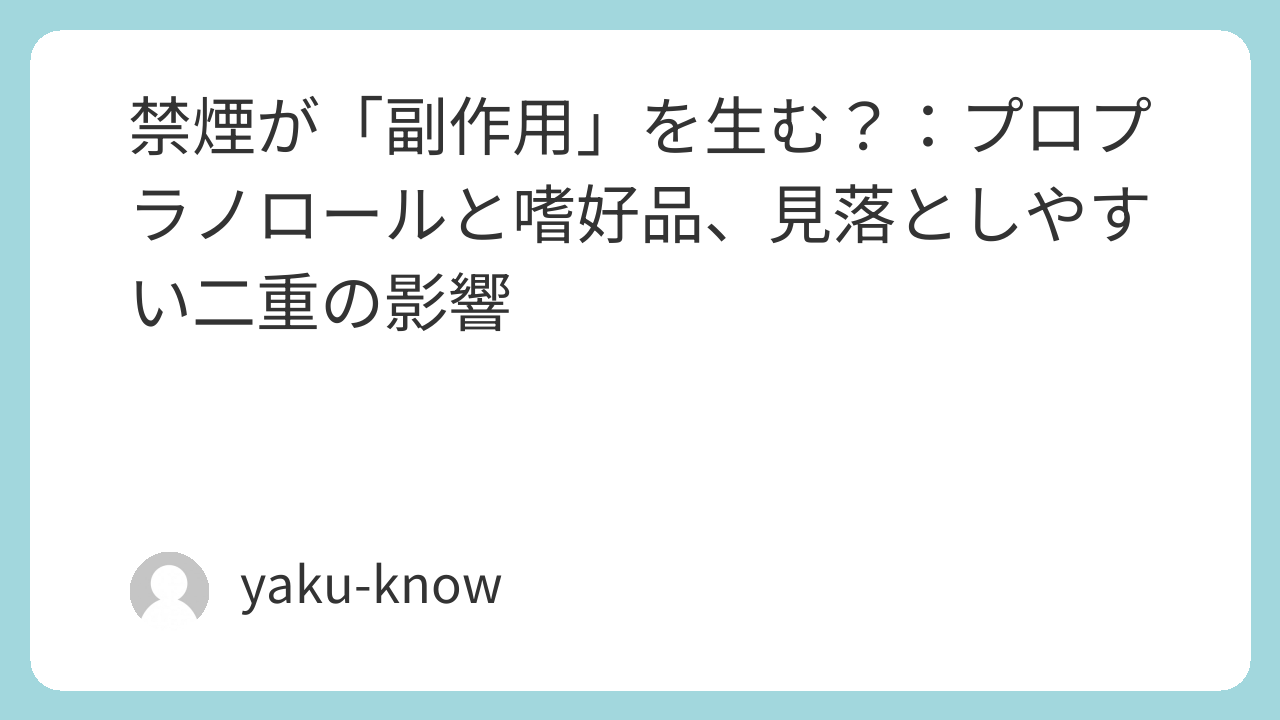 - プロプラノロール(商品名:インデラル他)の服用中に禁煙があれば、脈/血圧/症状のモニタリング → 必要に応じて用量調整の相談。
